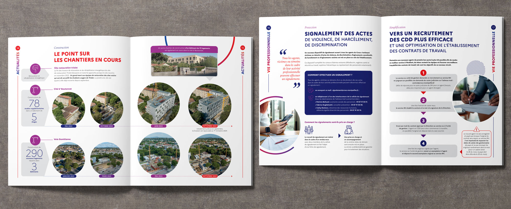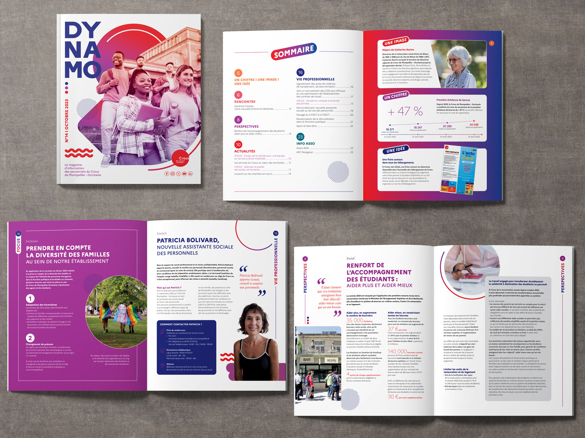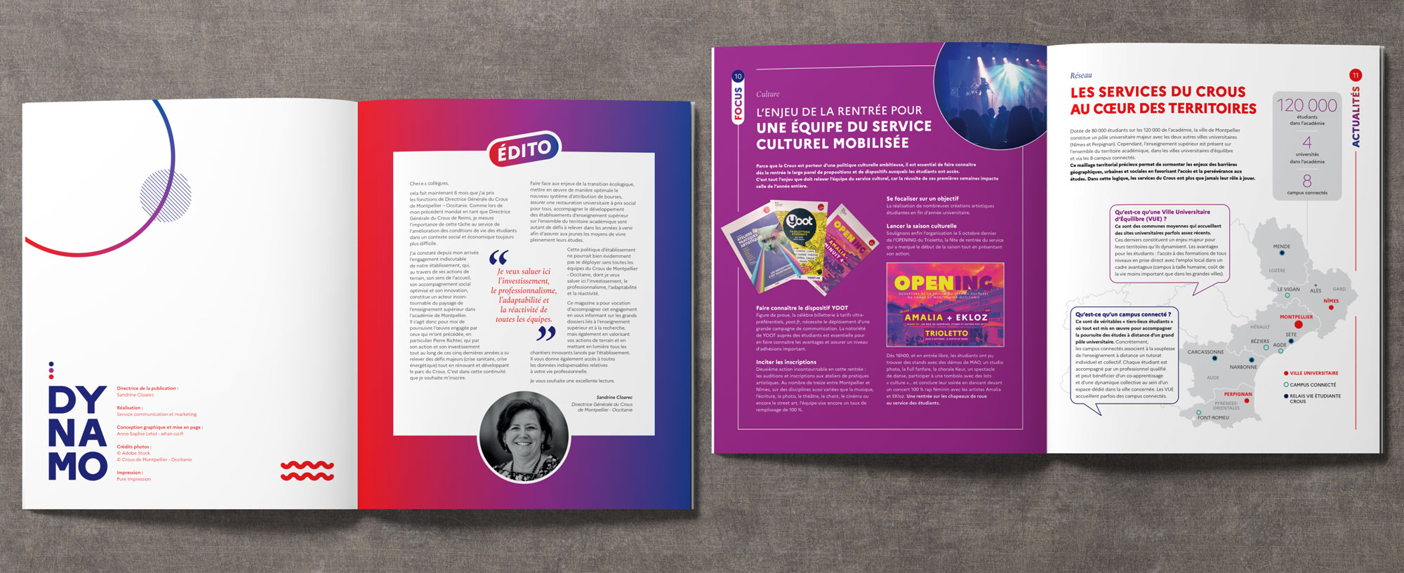 Pour informer les salariés des actualités, des démarches, des évolutions professionnelles, le Crous de Montpellier Occitanie diffuse un magazine interne, DYNAMO. J’ai eu le plaisir de faire la refonte graphique du magazine et de mettre en page les dernières éditions depuis 2023.